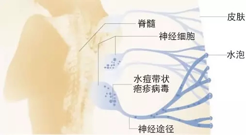 人是水痘-带状疱疹病毒的惟一宿主,其传播途径为“皮肤-空气-呼吸道”。病毒经呼吸道黏膜进入血液形成病毒血症,发生水痘或呈隐性感染,由于病毒具有亲神经性,感染后可长期潜伏于脊髓神经后根神经节的神经元内,当抵抗力低下或劳累、感染、感冒时,病毒可再次生长繁殖,并沿神经纤维移至皮肤,使受侵犯的神经和皮肤产生强烈的炎症,产生神经痛。本病愈后可获得较持久的免疫,故一般不会再发。