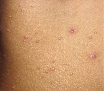 皮损表现为特征性有蜡样光泽的丘疹或结节,顶端凹陷,能挤出乳酪状软疣小体。潜伏期为一周到六个月不等。可发生于身体的任何部位, 常见于颈、躯干、下腹及外生殖器等部位。